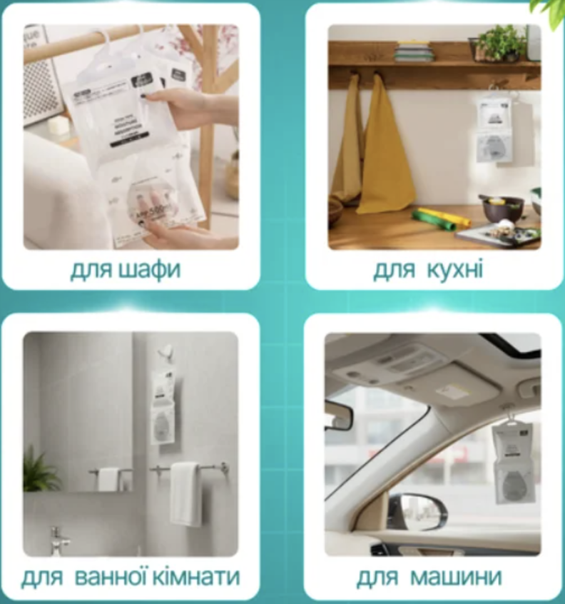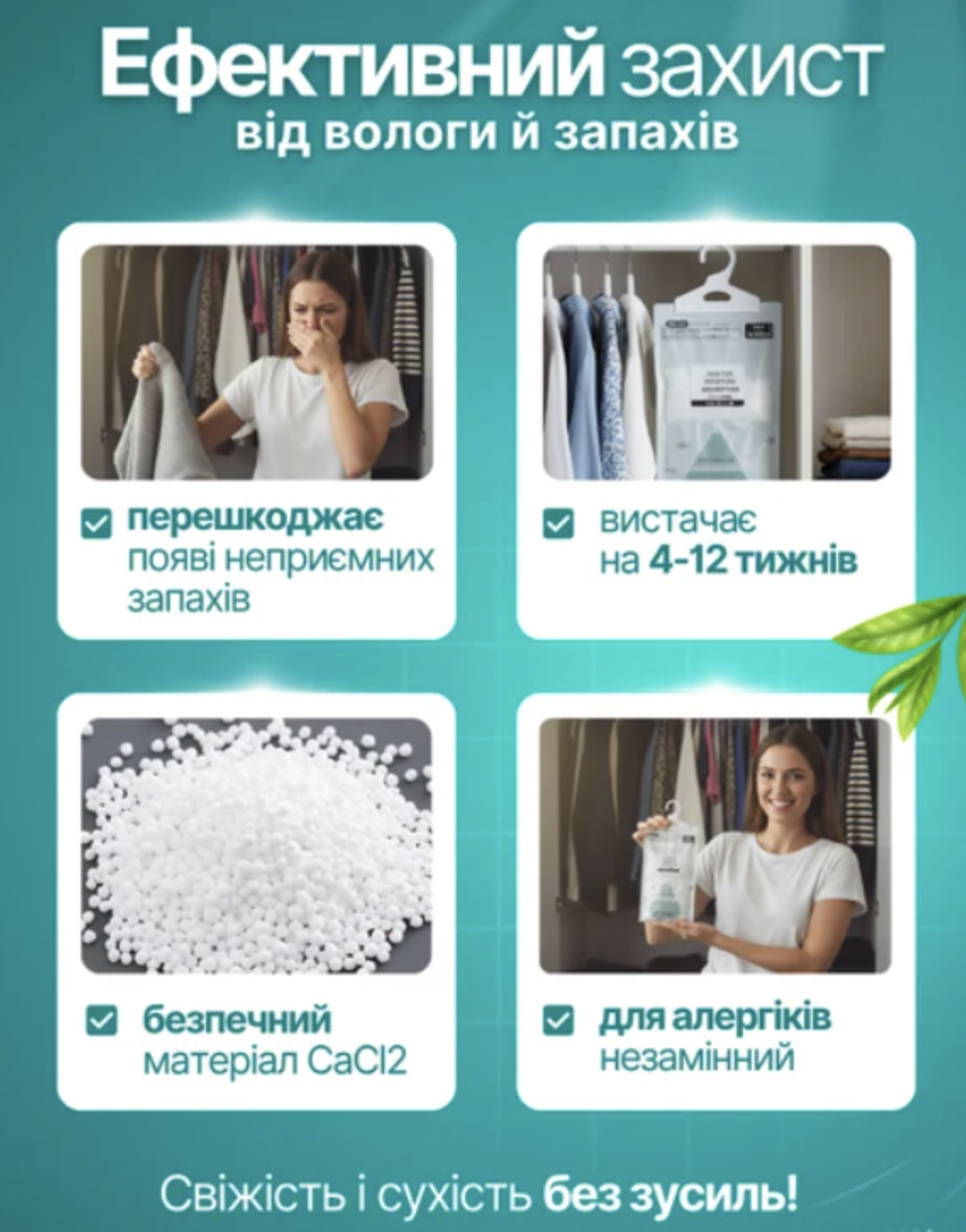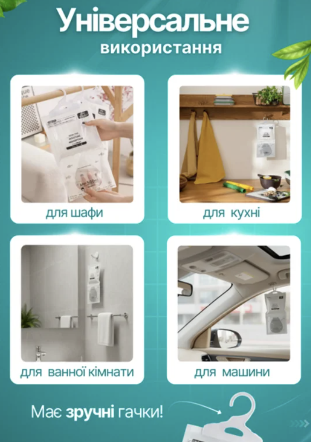 Цей компактний та ефективний засіб швидко абсорбує вологу з повітря, запобігає появі плісняви й грибка, а також захищає ваші речі та здоров’я.
